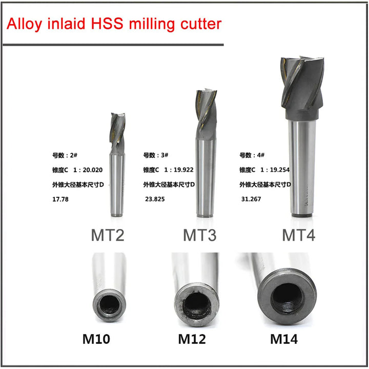 MT2 MT3 4# 20/25/30/35/40/50mm High speed steel insert carbide spiral milling cutter End mill with taper shank with welding edge